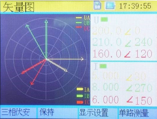 In this interface, the angle, positive direction, zero sequence position, reference angle, and whether to display UA, UB, UC, IA, IB, IC vectors can be realized. The interface is shown in Figure 5. Use the ←, → keys to move to the item to be changed, and use ↑, ↓ keys to change the item options.