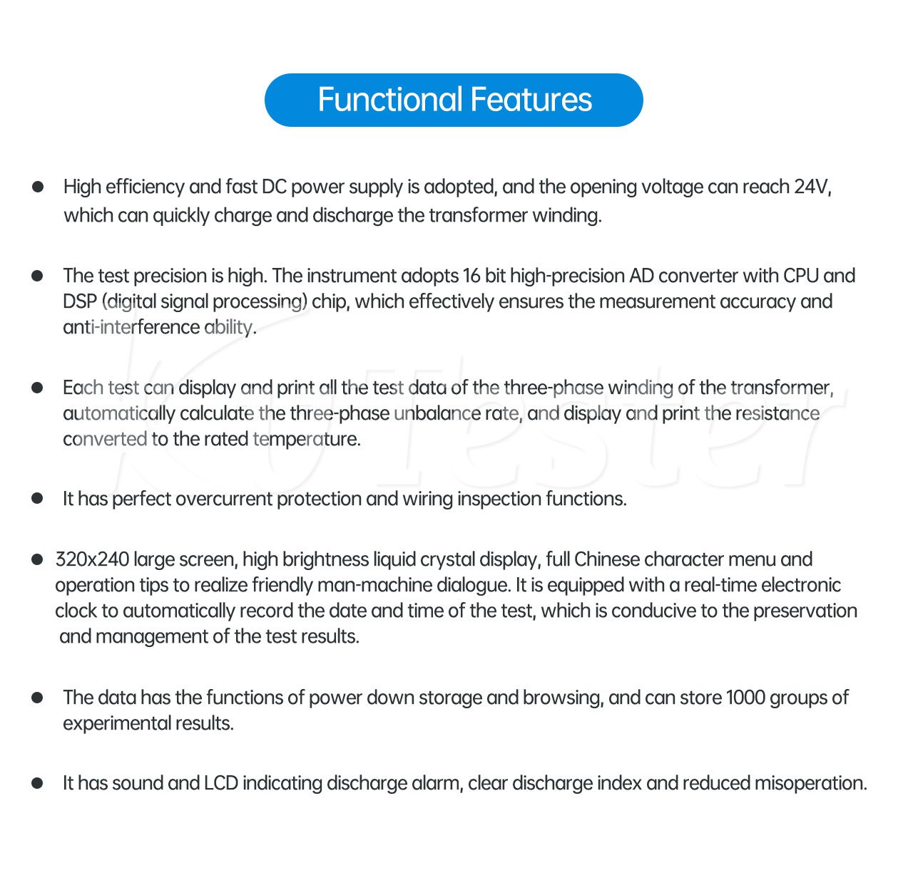 1. High efficiency and fast DC power supply is adopted, and the opening voltage can reach 24V, which can quickly charge and discharge the transformer winding.